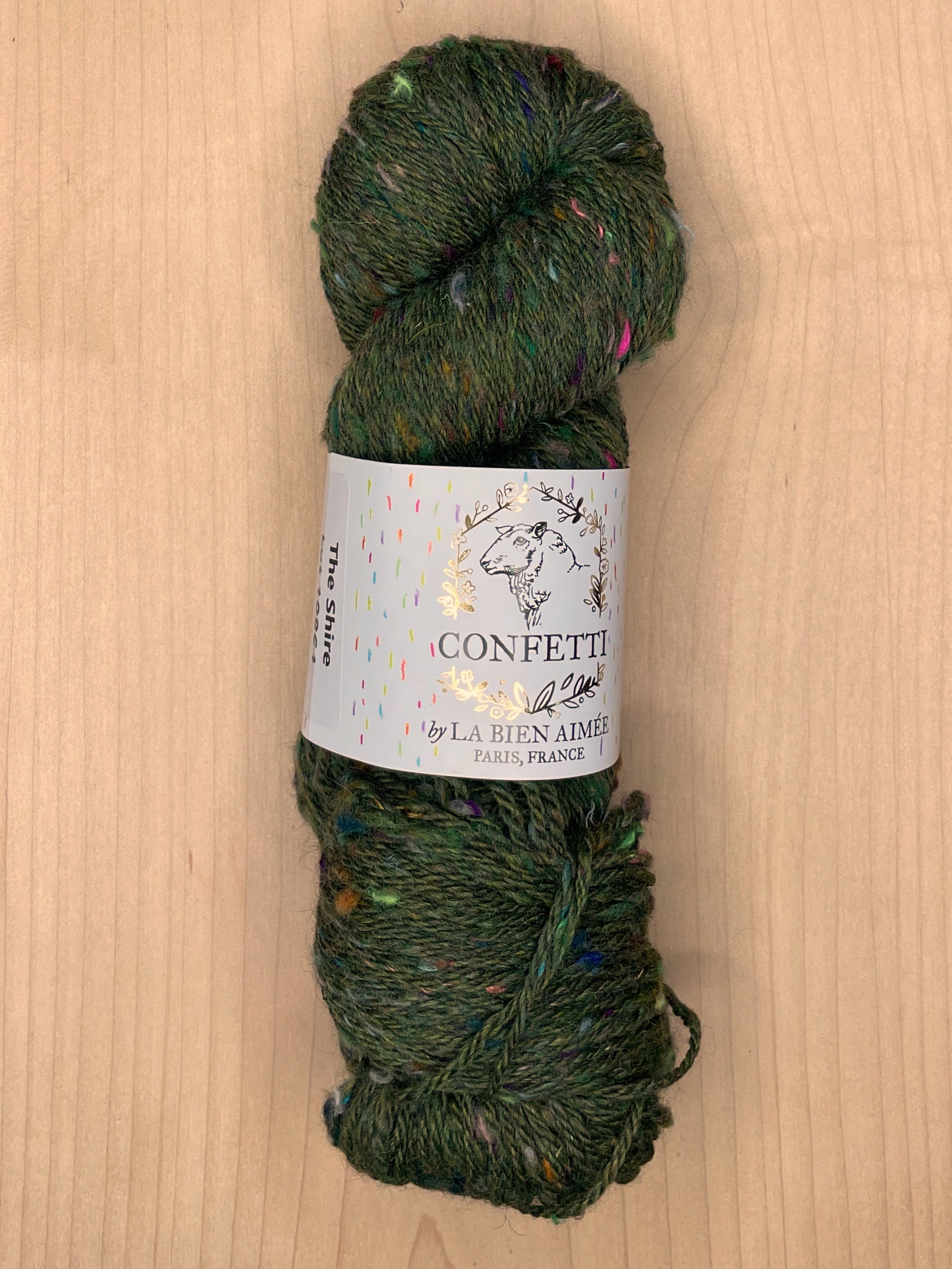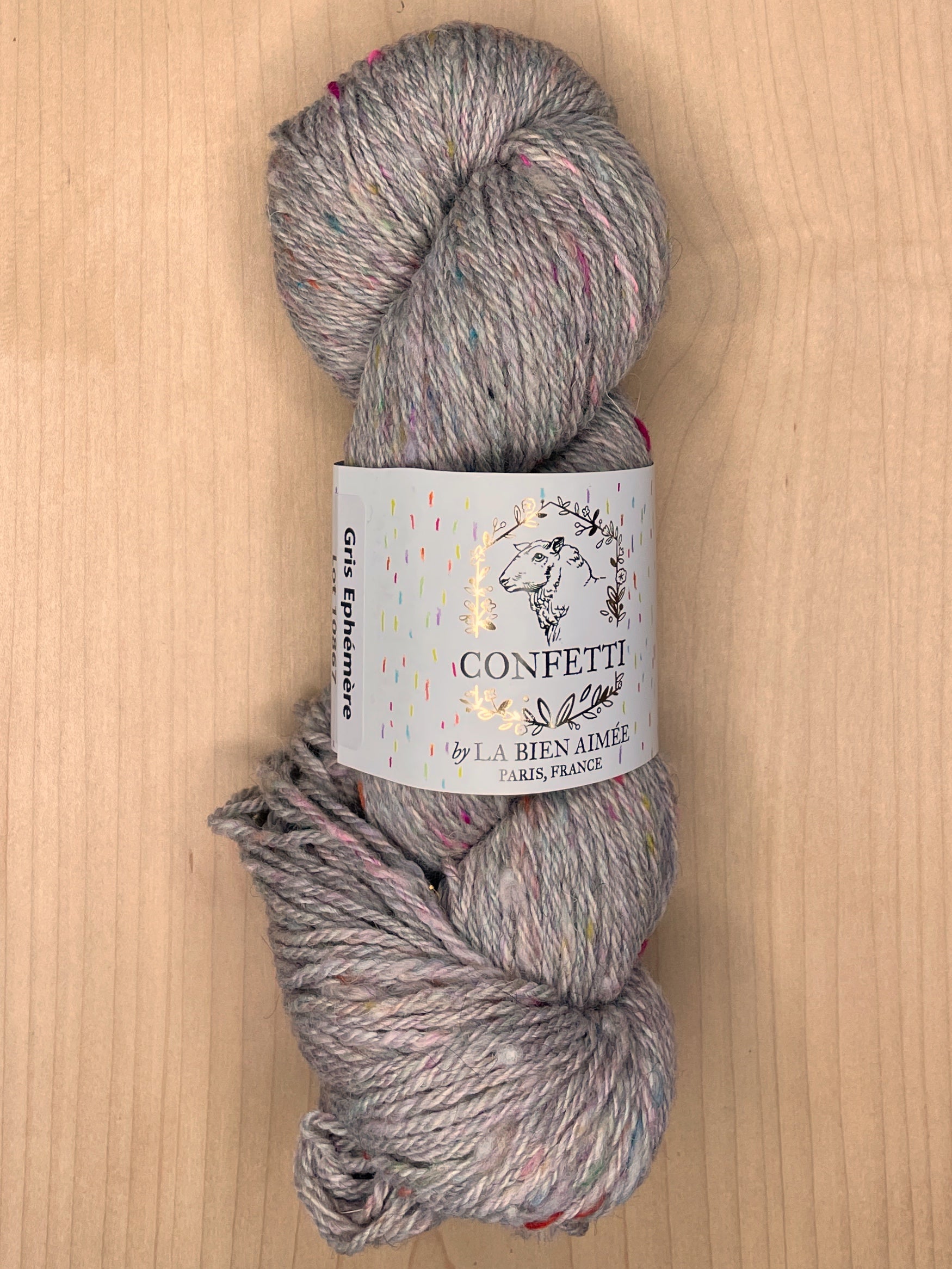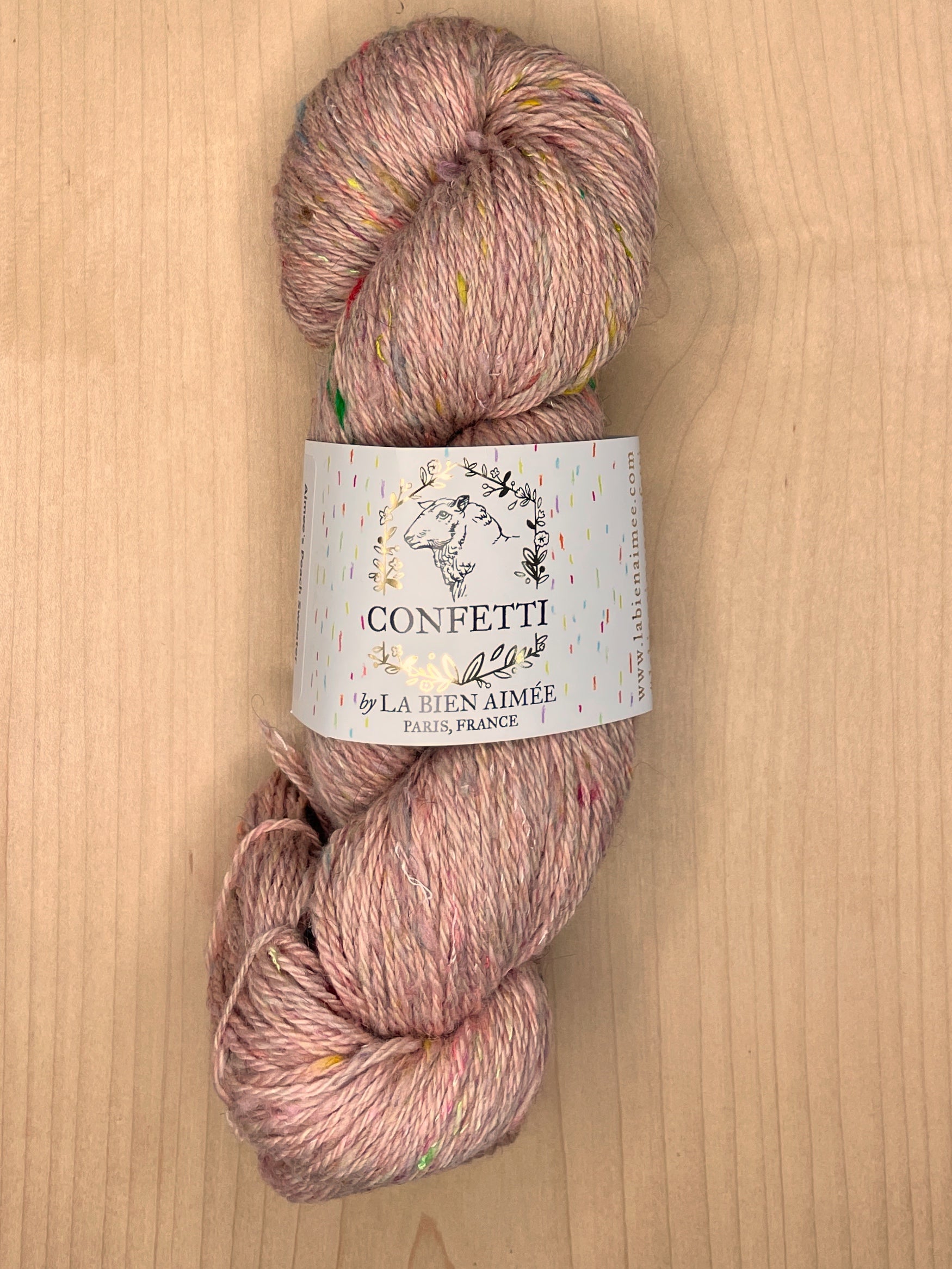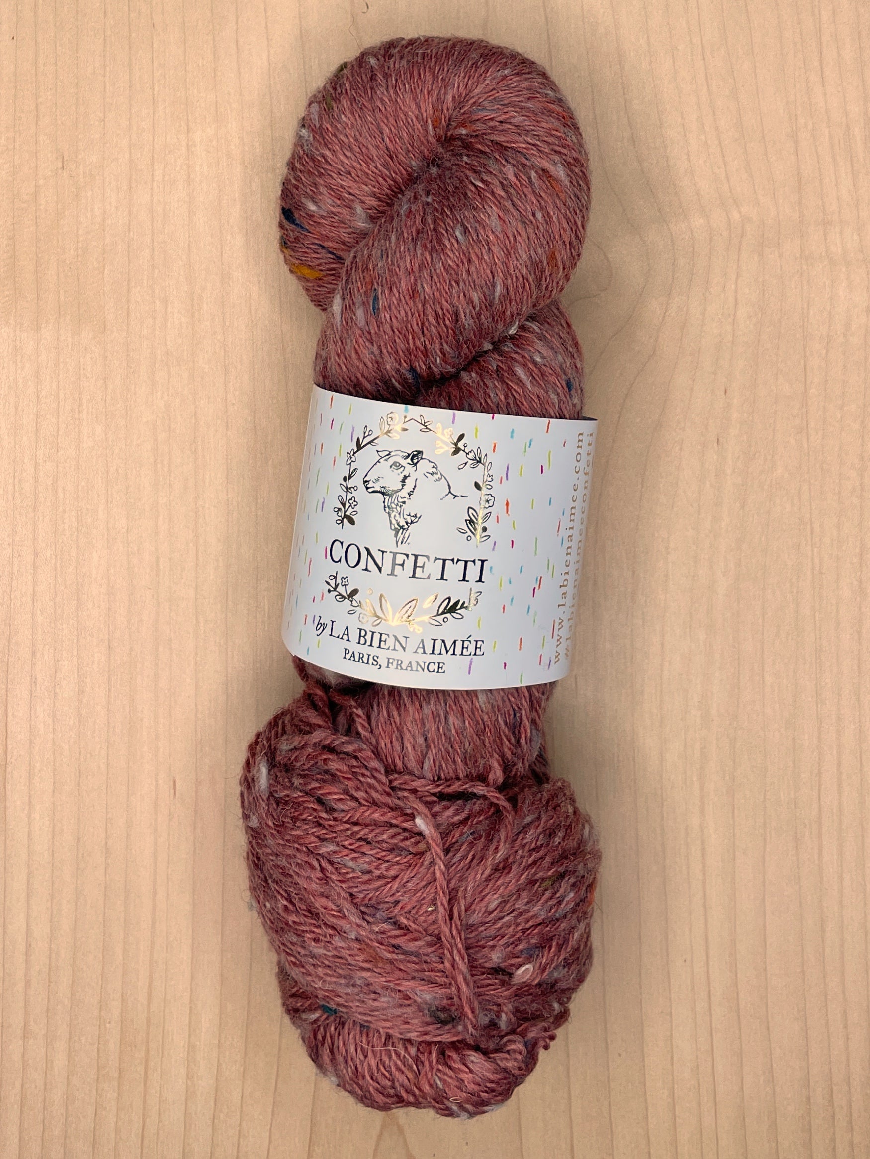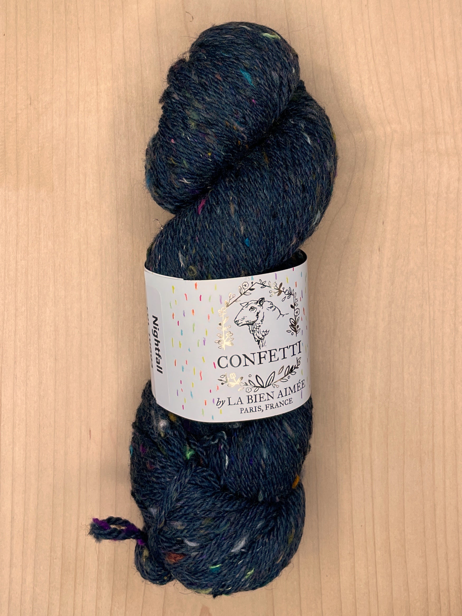 La Bien Aimee Confetti is a one of a kind limited edition yarn made from upcycled hand dyed yarn threads from the La Bien Aimée studio in Paris. It is spun with a super soft custom dyed mix of 18.5 micron fine Merino and Shetland wool. It is tweedy, plump and soft enough to be worn next to your skin.