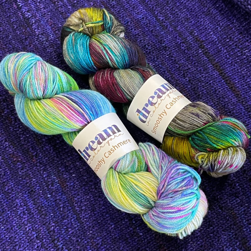 The kit include 2 skeins of Dream in Color Smooshy Cashmere in Charcoal Prismatic and Dreamgirls