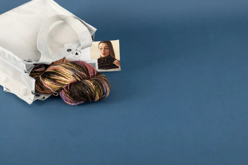 Cowl Kit contains one metallic Della Q Mesh Tote filled with a Madeline Tosh ASAP Super Skein (100% Super Bulky Superwash Merino Wool, 190 yds/275g) and Nightfall Cowl Pattern