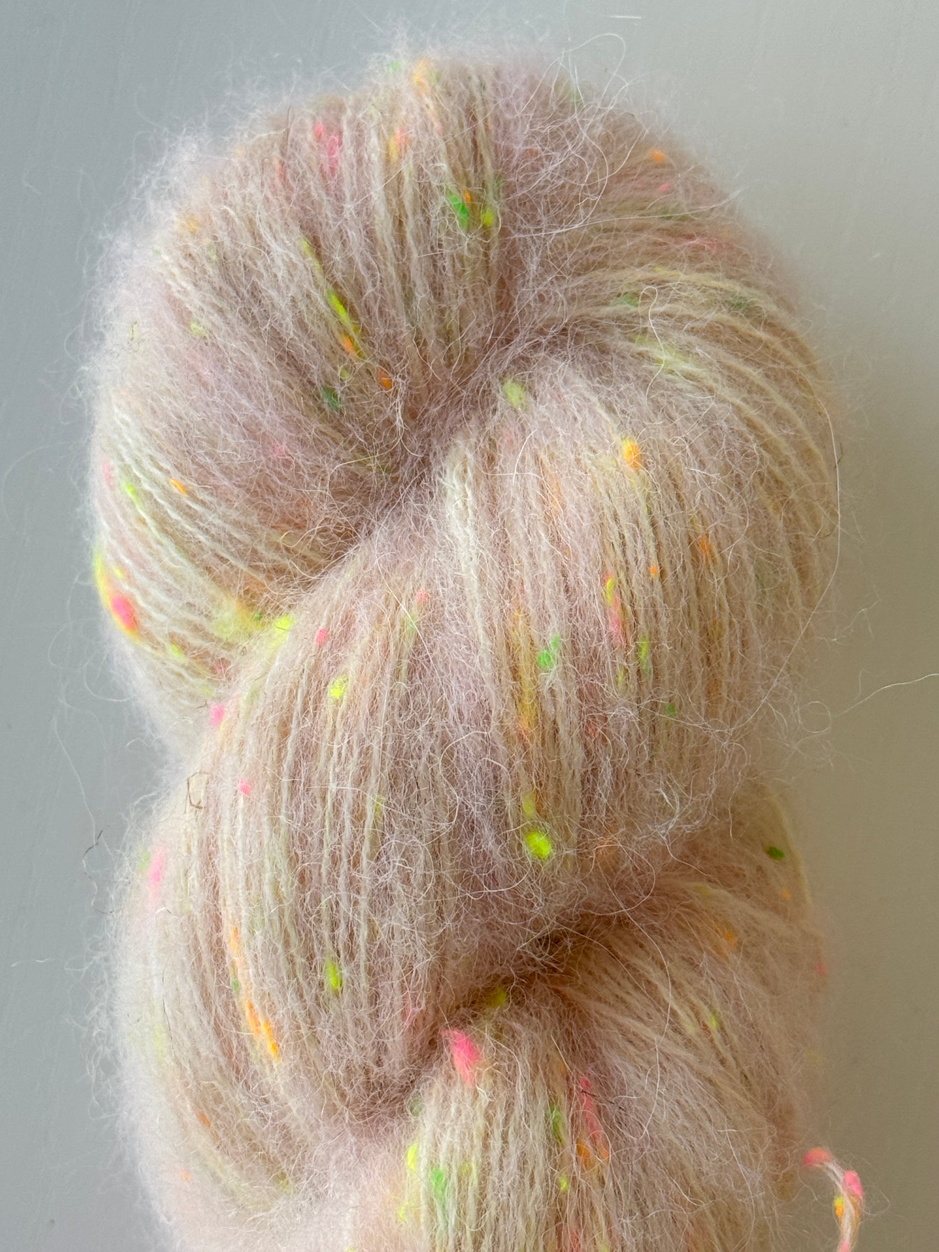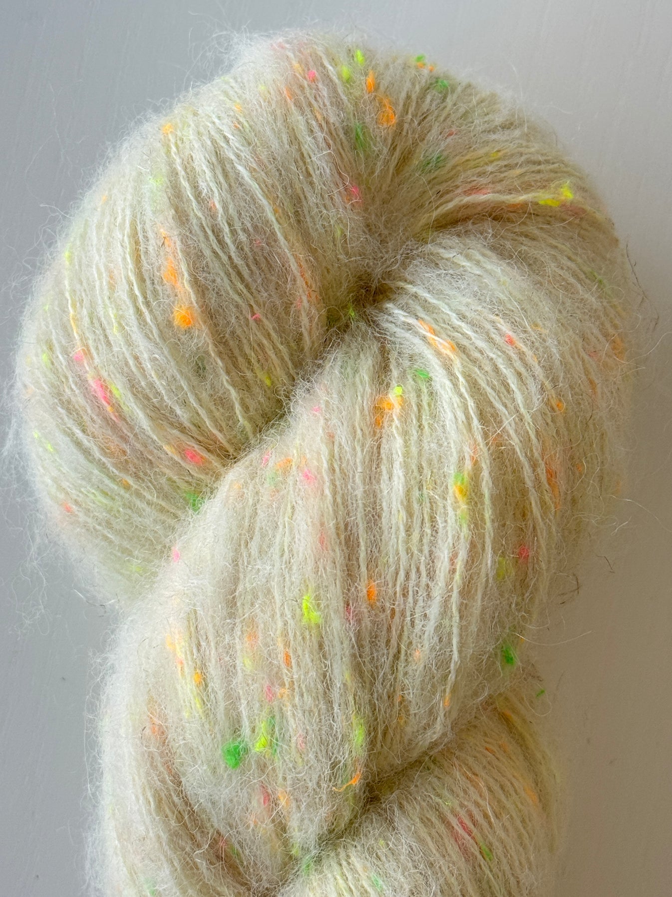 42% Superwash Merino, 32% Alpaca, 18% Neon Donegal Nep, 8% Linen